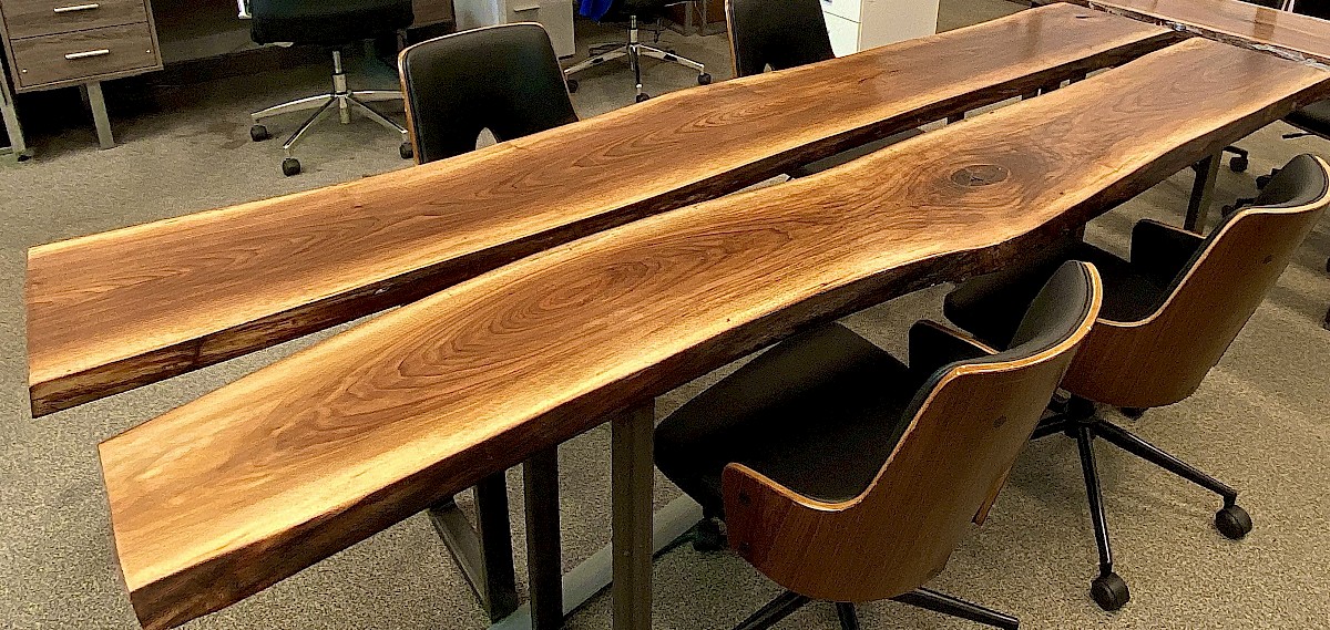 We turn reclaimed logs into live-edge slabs and boards, including single-piece slabs up to 42" wide, ready for custom projects.